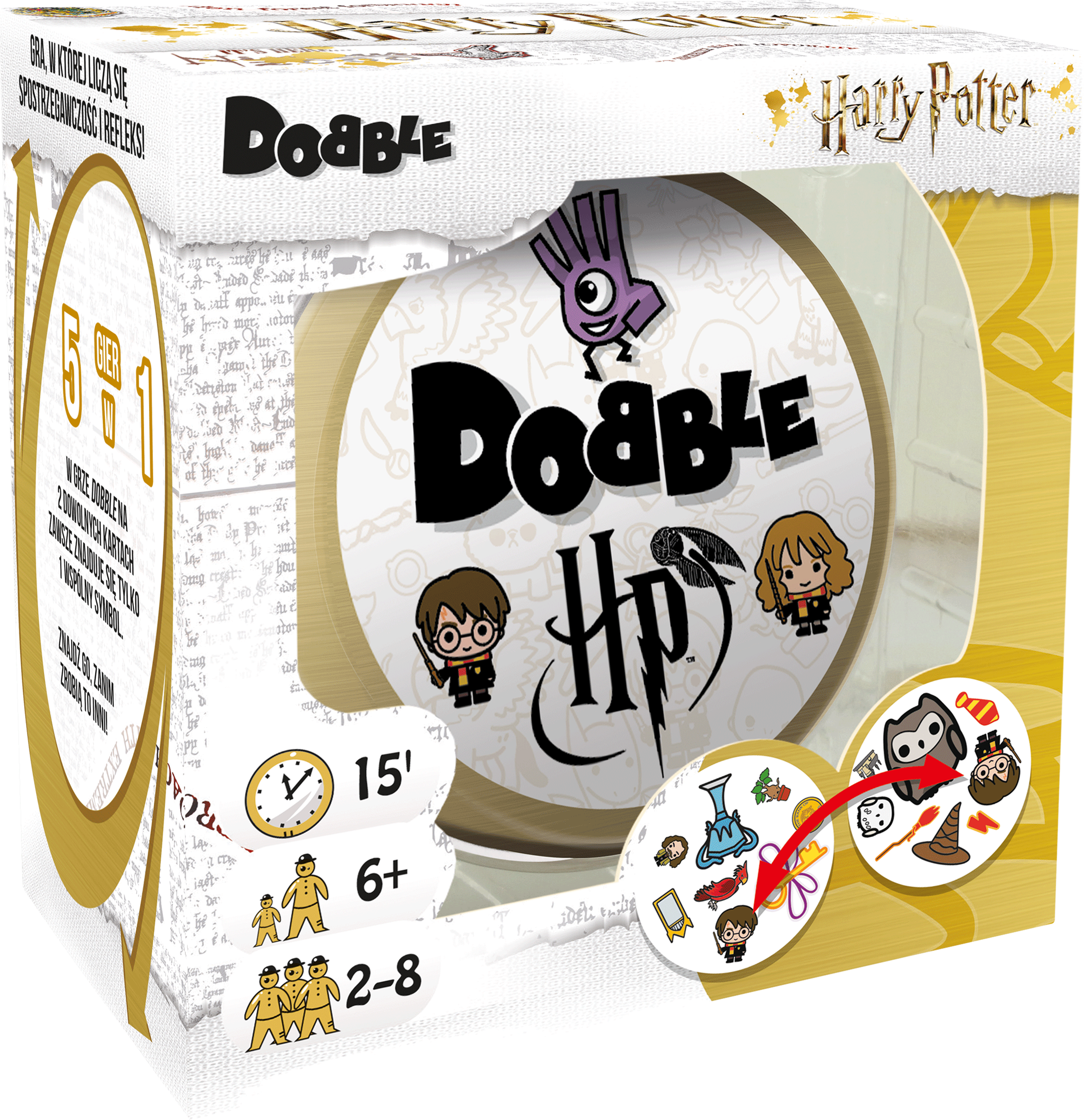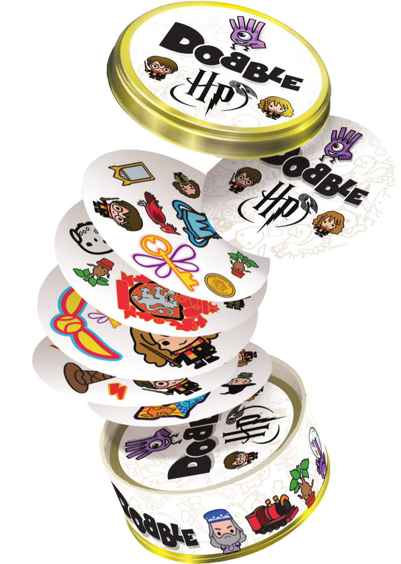 W Dobble można grać na wiele sposobów, a 5 z nich jest opisanych w instrukcji jako mini-gry. Aby utrudnić zabawę symbole na kartach bywają odwrócone i miewają różne rozmiary. Same karty są okrągłe i kolorowe, a każda z nich ma unikalny zestaw symboli związanych ze światem Harry’ego Pottera.