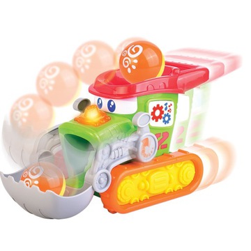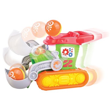 Dumel Discovery to interaktywne zabawki edukacyjne. Mając na uwadze rozwój poznawczy, motoryczny oraz muzyczny dzieci, zabawki tej serii w przyjazny i przyjemny sposób uczą liczenia, literowania, rozpoznawania kształtów, przedmiotów, zwierząt, roślin oraz dźwięków i melodii. Poprzez gry takie jak: zgadywanki, skojarzenia oraz zabawy pamięciowe rozwijają one zainteresowania i pomagają w zdobywaniu wiedzy i nowych doświadczeń. Wszystkie produkty tej marki są zgodne z międzynarodowymi standardami jakości i bezpieczeństwa.Chwyć za rączkę Buldożera i baw się w żonglowanie! Autko posiada ruchomą łopatę, która podczas przesuwania pojazdu w przód i w tył, podnosi się i opada, wrzucając do otworu w dachu buldożera piłeczkę, która następnie wypada wprost do łopaty, aby zabawa mogła rozpocząć się od nowa. Kolorowy przycisk znajdujący się na boku uruchamia dźwięk i światełko. Zabawie towarzyszy piosenka w języku polskim.