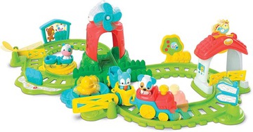Interaktywny pociąg, porusza się po kolorowych torach! Na torach znajdują się przeróżne elementy, które – po przejechaniu pociągu – uruchamiają mechanizmy, takie jak obracająca się karuzela, czy wiatrak. Ciuchcia, napędzana na baterie, wydaje dźwięki pociągu oraz może przewozić 3 zwierzęcych pasażerów, dzięki dołączonym do zestawu wagonikom. Kolorowe tory zachęcają do zabawy!