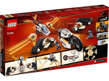 Wkrocz do akcji za sterami niesamowitego pojazdu ultradźwiękowego 4 w 1 i stocz walkę z wężowymi wojownikami! Rozłóż model na części, by stworzyć samolot ze złotymi ostrzami, które pełnią rolę skrzydeł, dwa pojazdy terenowe i odlotowy motocykl godny prawdziwego ninja. Pokonaj Rattlę i Mezma, a potem ustaw na półce limitowaną, złotą minifigurkę Zane’a w wersji Legacy, by uczcić dziesięciolecie zestawów LEGO® NINJAGO®.Spektakularny zestaw NINJAGO® z pojazdem 4 w 1! Pojazd ultradźwiękowy 4 w 1, który pozwala zbudować motocykl, samolot i dwa pojazdy terenowe, z pewnością zachwyci dzieci.Dzieci mogą odgrywać zdumiewające przygody z pierwszego sezonu serialu LEGO® NINJAGO® dzięki odświeżonej wersji zestawu Pojazd ultradźwiękowy (71739). Model 4 w 1 da się rozłożyć na części, by stworzyć motocykl, samolot odrzutowy ze sprężynowymi działkami oraz dwa pojazdy terenowe. Zabawki, dzięki którym dzieci spełnią marzenie o byciu ninja! Ten niepowtarzalny zestaw zawiera siedem minifigurek: ninja Kaia, Zane’a, Cole’a i Jaya oraz wężowych wojowników Mezma i Rattlę z plemienia Hipnokobr. Dzięki nim dzieci mogą bez problemów inscenizować zawzięte pojedynki. W pudełku znajduje się też nowość na czerwiec 2021 roku — złota kolekcjonerska minifigurka Zane’a w wersji Legacy z podstawką, stworzona z okazji dziesięciolecia serii NINJAGO. Fantastyczne zestawy LEGO do twórczej zabawy! Zestawy LEGO NINJAGO przenoszą dzieci do świata pełnego przygód. Młodzi konstruktorzy mogą połączyć siły z odważnymi bohaterami i stanąć do walki z siłami zła podczas zabawy niesamowitą kolekcją zabawek, wśród których znajdują się smoki, roboty i nie tylko.• LEGO® NINJAGO® Pojazd ultradźwiękowy (71739) to wyjątkowy zestaw 4 w 1, który można rozłożyć na części, by zbudować samolot odrzutowy, motocykl i dwa pojazdy terenowe. Dzięki niemu zabawa nie ma końca!• Ekscytujący zestaw zawiera siedem minifigurek: ninja Kaia, Cole’a, Zane’a, Jaya oraz Zane’a w wersji Legacy, którzy stają w szranki z Rattlą i Mezmem, wężowymi wojownikami znanymi z pierwszego sezonu serialu NINJAGO®.• Dzieci mogą pilotować ekscytujący samolot odrzutowy ze sprężynowymi działkami lub prowadzić motocykl i dwa pojazdy terenowe. W każdym z czterech pojazdów mieści się minifigurka ninja.• Zawiera złotą kolekcjonerską minifigurkę Zane’a w wersji Legacy z małą podstawką z okazji dziesięciolecia zestawów NINJAGO®.•