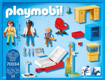Playmobil 70034 Zestaw startowy Wizyta u pediatry to świetne klocki, które zapewnią wiele godzin wspaniałej zabawy i rozwiną wyobraźnię Twojego dziecka. Zestaw zawiera wyposażenie gabinetu lekarskiego dla małych pacjentów.