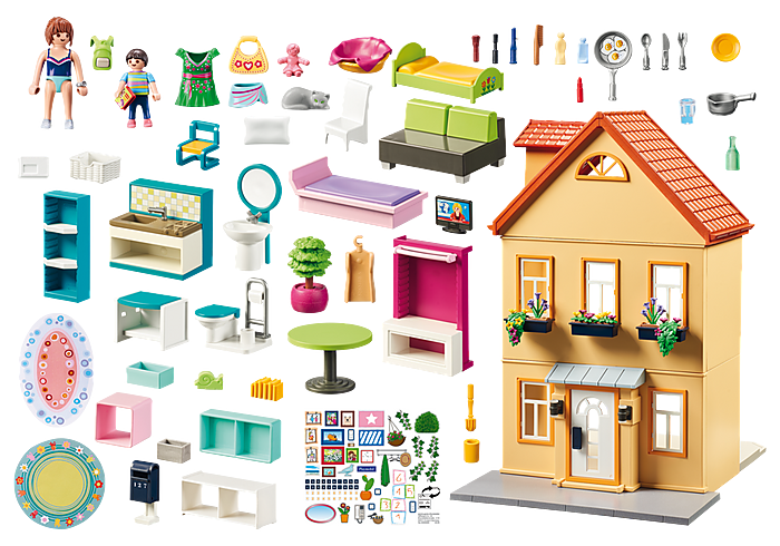 - akcesoria dodatkowe, wzbogacające zabawę: kwiat w donicy, dywaniki, naczynia i sztućce, kosmetyki, zabawki, telewizor i wiele innych