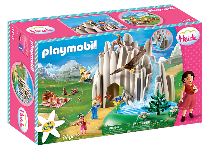 Zakres dostawy: 1 x Playmobil Heidi Am Kristallsee z Heidi, Peter i Clara, 74-częściowy zestaw figurek do gry z instrukcją (może nie być dostępna w języku polskim): 1 skałka z kryształowym jeziorem, 3 figurki, 70 akcesoriów, materiał: tworzywo sztuczne, dł. x gł. x wys.: 37 x 27 x 25,