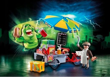 Żarłoczny duch Slimer objada się przy budce z hot-dogami.
